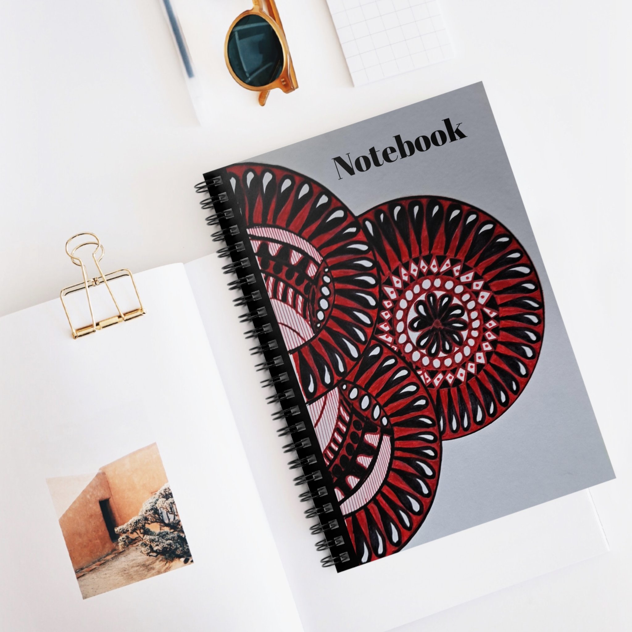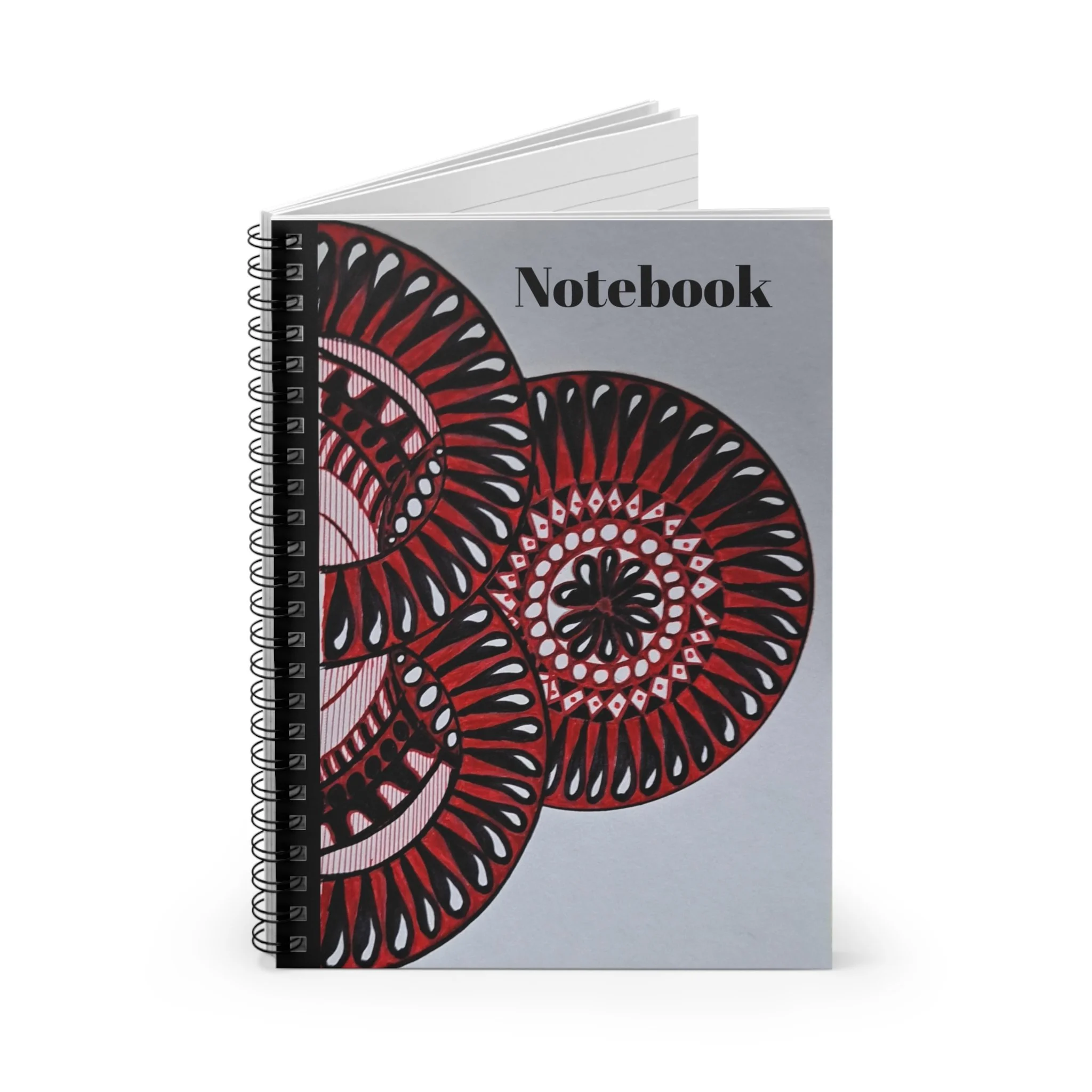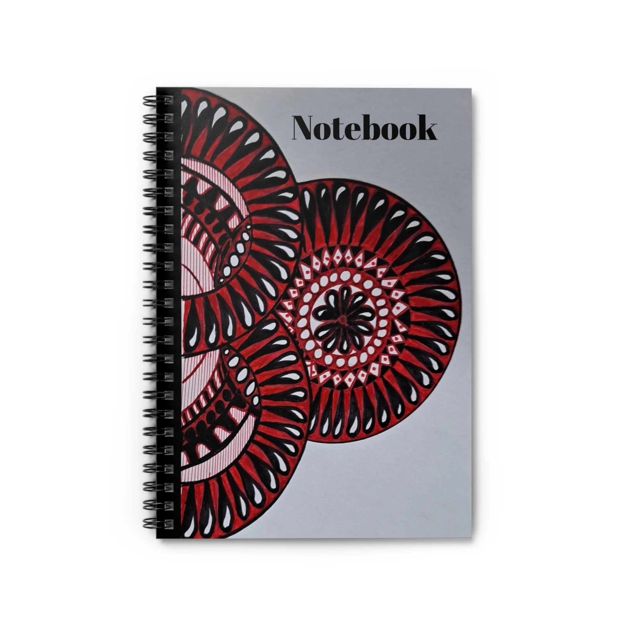 A compact ruled notebook that brings a touch of handcrafted charm to daily notes. The front cover features bold circular mandala-like art in deep reds and soft pinks against a muted grey background, lending this notebook an artistic, focused energy. Inside, 118 lined pages on smooth 90gsm paper invite deliberate handwriting — from sketches of ideas to lists and journal entries. A sturdy 350gsm cover and dark grey back provide structure, while the metal spiral binding lets the pages lie flat and makes removing sheets neat and simple. An interior document pocket keeps loose receipts, tickets, or reference notes close at hand. Sized at 6" x 8", it slips easily into bags for classes, studio sessions, or coffee shop work bursts.